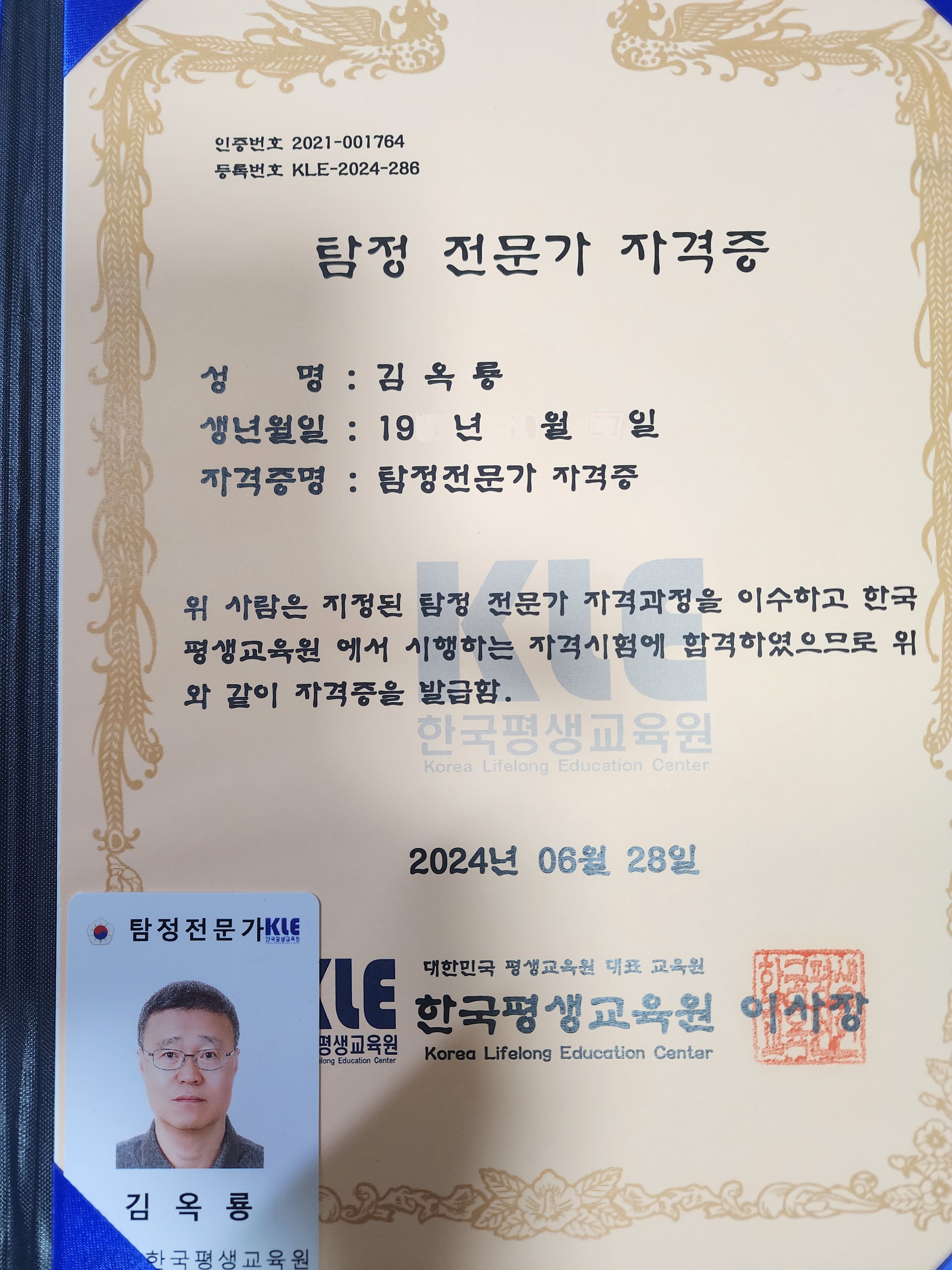 옥룡행정사는 탐정 전문가 자격이 있습니다.