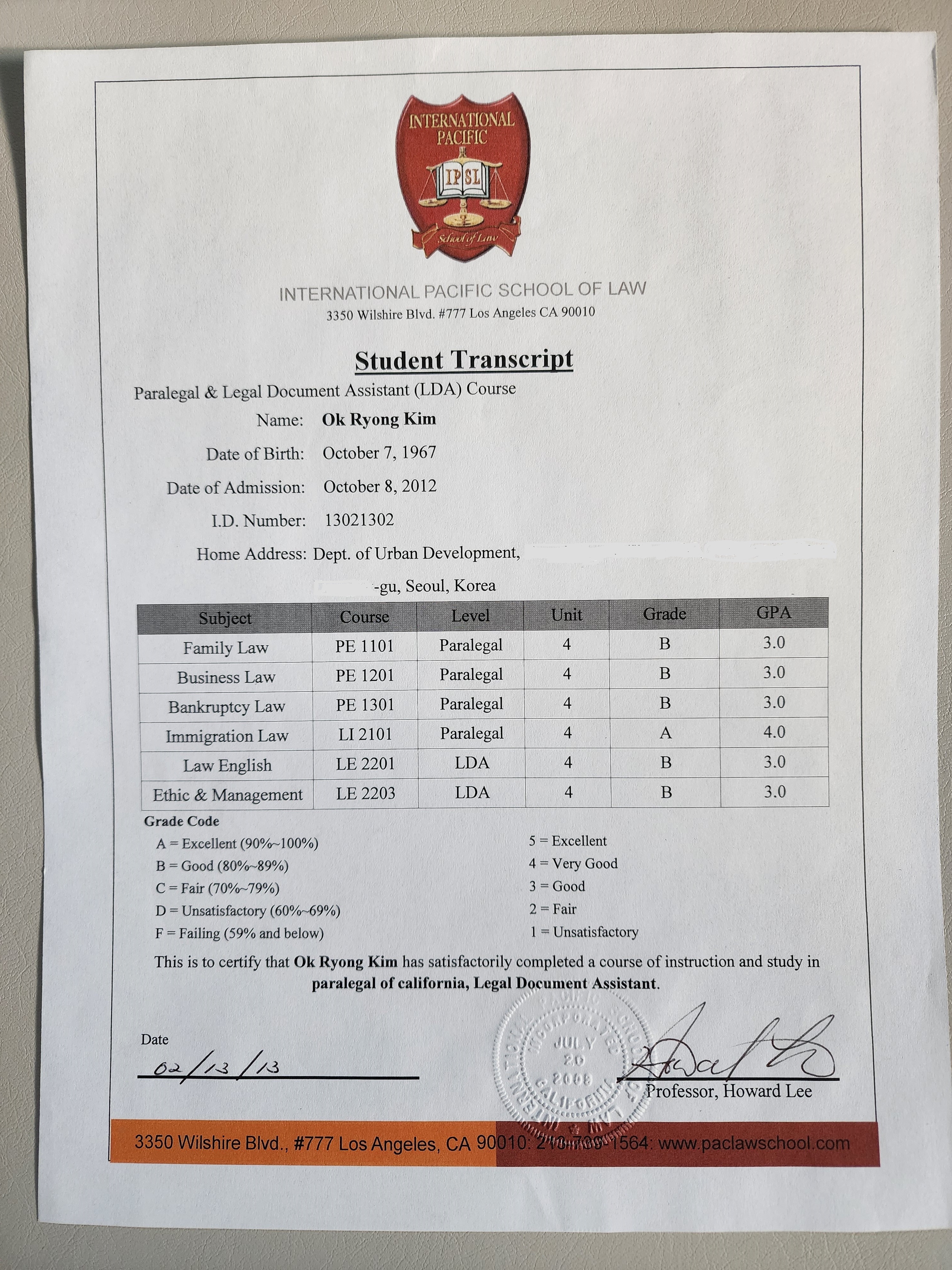 2013년 통신로스쿨에서 California주에서 LDA를 개업할 수 있는 Legal Document Assistant 과정을 수료하였습니다.